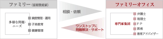 そもそもファミリーオフィスとは、資産管理から子弟教育までファミリー(「ファミリービジネス」などの富裕資産家)が解決すべき様々な問題をファミリーの立場にたって一緒に解決する専門家集団を束ねる事務所のことをいいます。ファミリーオフィスには各分野の専門家がおり、これを活用する資産家はファミリーオフィスに自らの様々な問題を相談すると、オフィスの方で適切な専門家を選んで解決してくれるというワンストップ機能が重宝がられているようです。
